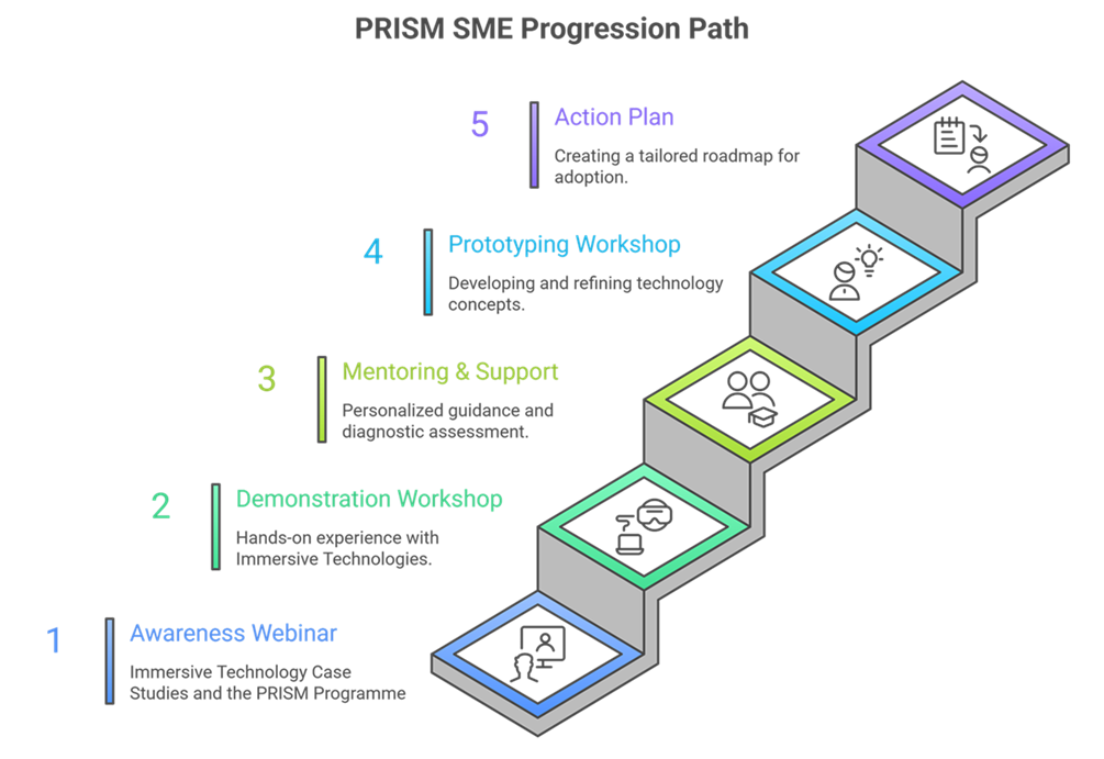 PRISM is the all‑island gateway for manufacturing SMEs to demystify the adoption of immersive technologies (XR, Digital Twins and AI) without the risk or jargon.